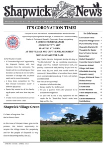 Coronation Time! Shapwick Village Green PC/Community Group Shapwick Starlets WI Thoughts for Easter Dora's Poetry Corner Bunny Hop! Global Shapwick? From the Horse's Mouth Dovecote School Village Hall News Affordable Housing Shapwick Jam(s) Verges, Ditches & Trees History Group Broadband Survey Cricket Club Avalon Marshes I wish Shapwick had... What's On One year on from the Platinum Jubilee celebrations we have another opportunity to join together as a village, to celebrate the Coronation of King Charles III. To this end Shapwick Community Group is organising: A CORONATION BIG LUNCH ON SUNDAY 7TH MAY STARTING AT 2:00PM AT THE VILLAGE AND ON “THE VILLAGE GREEN” SO PLEASE SAVE THE DATE Volunteer to help on the day Donate food for the Buffet Lunch Are you a qualified First Aider prepared to be available for the games? Do you have access to any equipment we will require for the “Sports Day Events”: sacks, bean bags and the like. King Charles has also designated Monday 8th May as “The Big Help Out”. We are considering organising a Village Litter Pick, footpath maintenance work, and possibly a communal seed planting. Do you have any other ideas, big and small, that would benefit the community? We would love to hear about them: please email coronation@shapwick.org. Or text / call Graham on 07484160913 How else can everyone help? A “Coronation Big Lunch” organised by the Shapwick Starlets, with food donations from the community. The Starlets will be co-ordinating your food donations so that we do not end with a mountain of sausage rolls, so please watch out for more information A fancy dress competition for “The Best Dressed Coronation Guest” in different age groups Sports Day events for all the family: egg & spoon, sack race, bean bag race etc. A Table Tennis tournament on our new Outside Table Tennis Table. So far the plans include: S PR I NG I S SUE | APR I L 2 0 2 3 Call for Volunteers & Contributions In this issue: S P R I N G I S S U E , A P R I L 2 0 2 3 B R O U G H T T O Y O U B Y T H E S H A P W I C K C O M M U N I T Y G R O U P 1 1 2 2 2 3 3 4 4 4 5 5 5 6 7 7 7 8 8 8 8 IT’S CORONATION TIME! It's been a long time...but We're almost there! As this issue of Shapwick News goes to the printers, this historic opportunity to acquire the Village Green for perpetuity and for the people of Shapwick is very close to becoming reality. See p.2. Shapwick Village Green